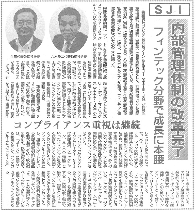 日本証券新聞(10月6日付)に、SJI代表取締役八木会長、牛社長のインタビューが掲載されました。